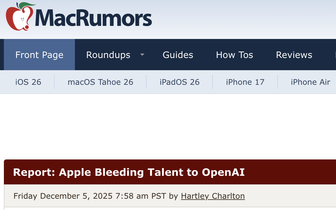 【环球网科技综合报道】12月6日消息,据macrumors援引《华尔街日报》报道,近几个月内,已有数十名深耕音频、可穿戴设计、机器人等核心领域的苹果工程师与设计师陆续离职,加入人工智能公司OpenAI。