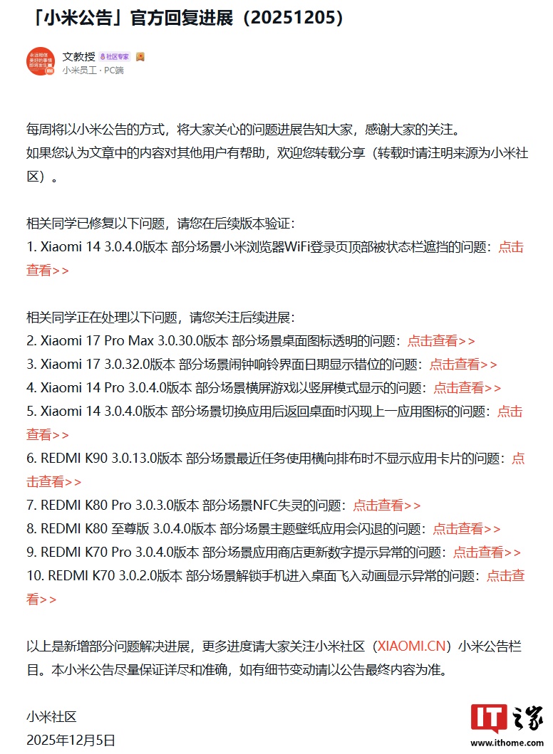 IT之家 12 月 7 日消息,小米员工本周在小米社区更新澎湃 HyperOS 最新优化进展诚信优配,其中提到用户所反馈的 Xiaomi 14 在 3.0.4.0 版本部分场景小米浏览器 WiFi 登录页顶部被状态栏遮挡的问题已优化,可在后续版本验证。此外,小米官方还定位到了 Xiaomi 17 系列部分机型的相关问题。